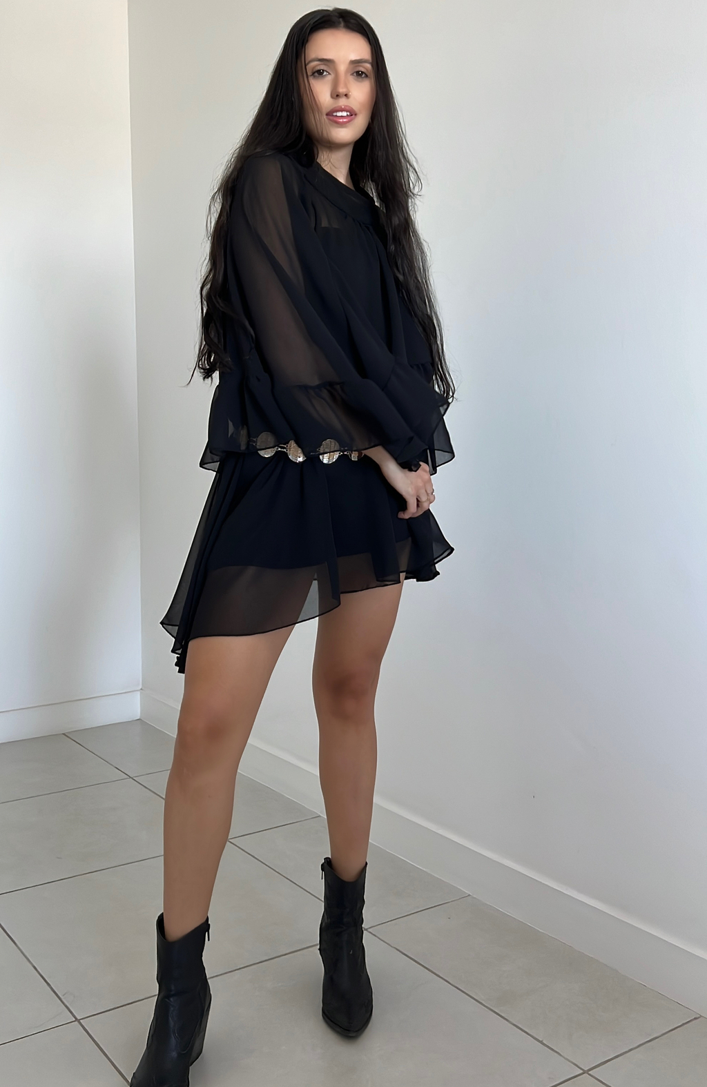 O grande diferencial da peça é sua capa/túnica sobreposta, que transforma o vestido básico em uma produção sofisticada e elegante. E não para por aí: a capa também pode ser usada separadamente como blusa, compondo looks com jeans, saias ou alfaiataria. Uma peça coringa para multiplicar suas produções e se adaptar a diferentes estilos e ocasiões.