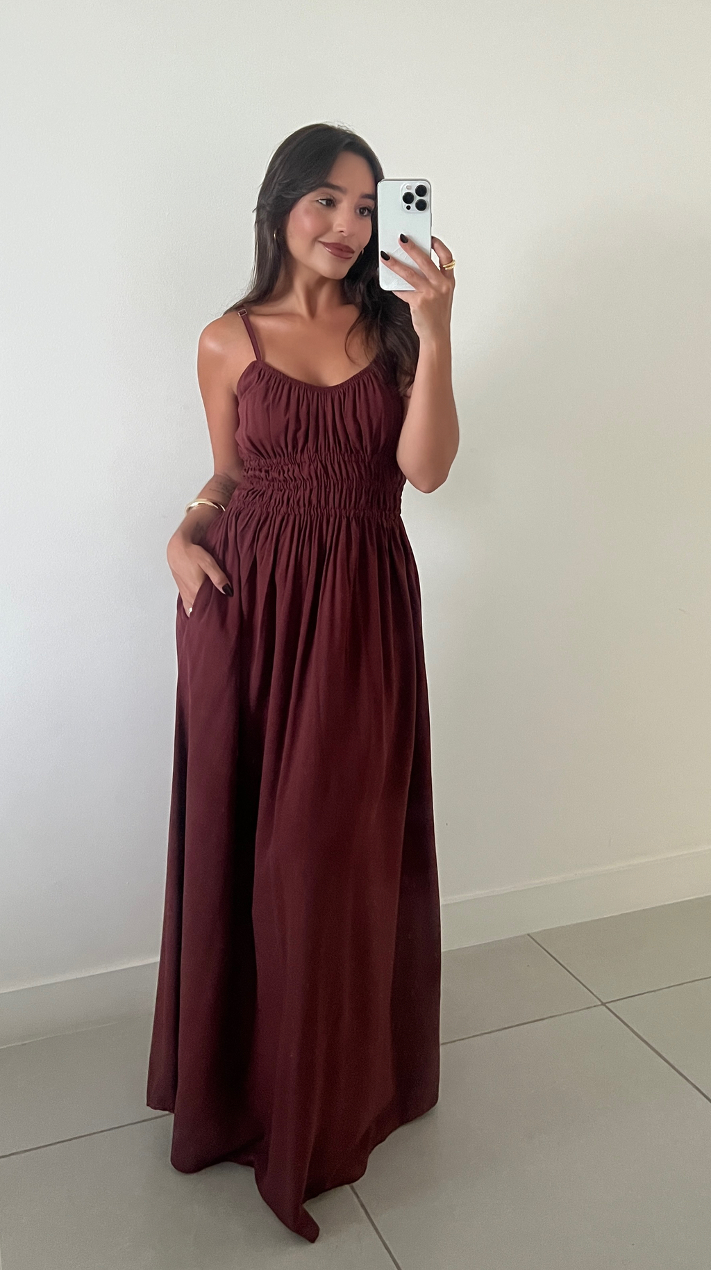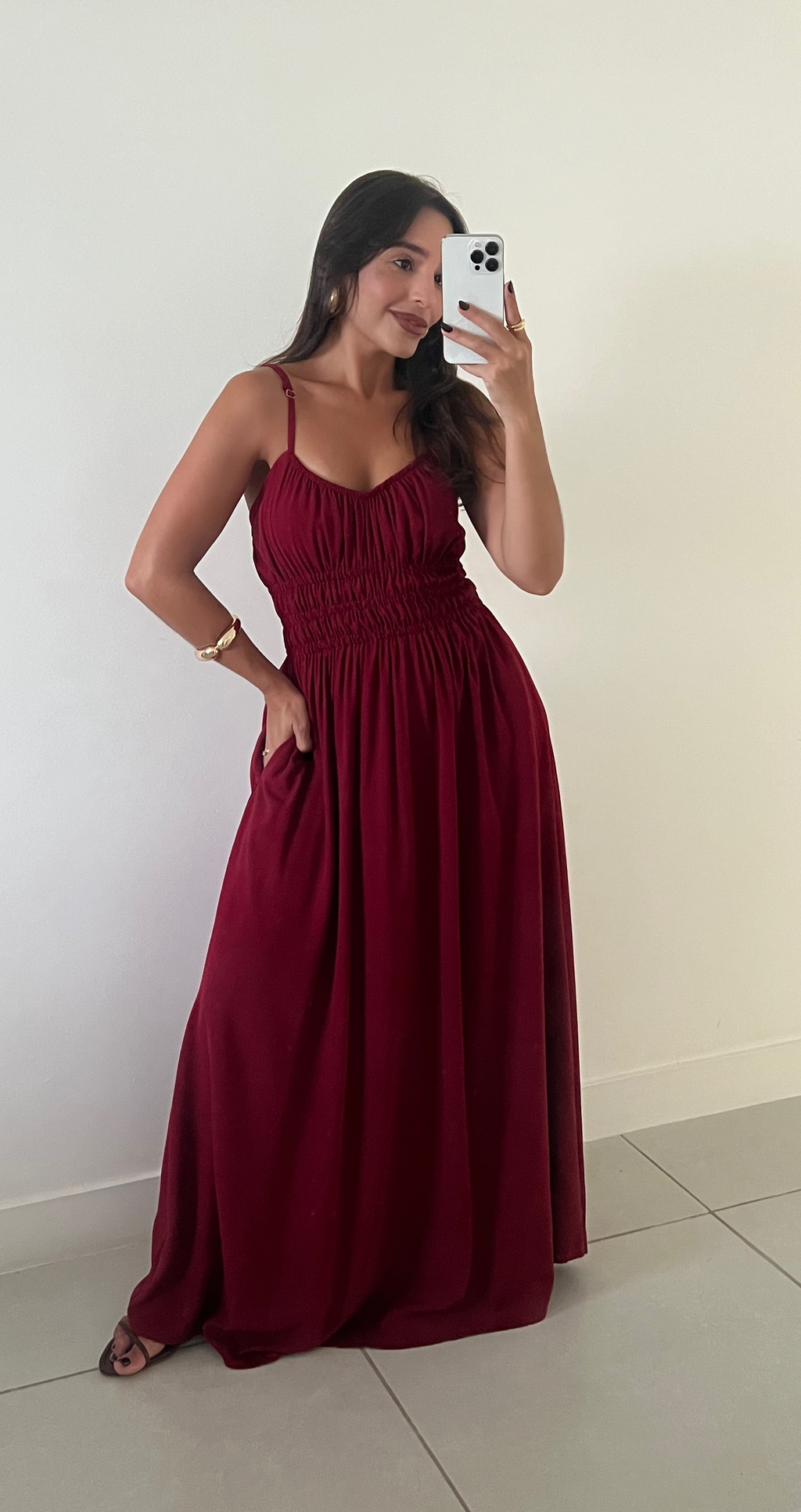 O destaque fica por conta do lastex posicionado abaixo do busto, que valoriza a cintura e se adapta com conforto a diferentes biotipos, tornando o vestido democrático e versátil. O franzido sutil no busto, aliado ao tecido duplo, oferece sustentação e um toque extra de feminilidade. As alças reguláveis garantem o ajuste perfeito, enquanto os bolsos embutidos conferem praticidade sem abrir mão do charme.